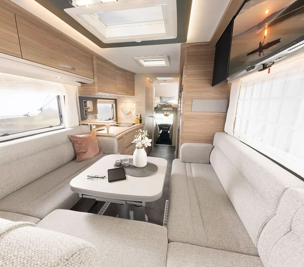 Ein echtes Herzstück des Alpa A 6820-2 ist die großzügige Rundsitzgruppe im Heck. Hier genießen Reisende ein wohnliches Ambiente mit bester Rundumsicht – ideal zum Entspannen, Lesen oder für gemütliche Abende. Durch die offene Gestaltung entsteht ein echtes „Wohnzimmer-Feeling“ auf Rädern.